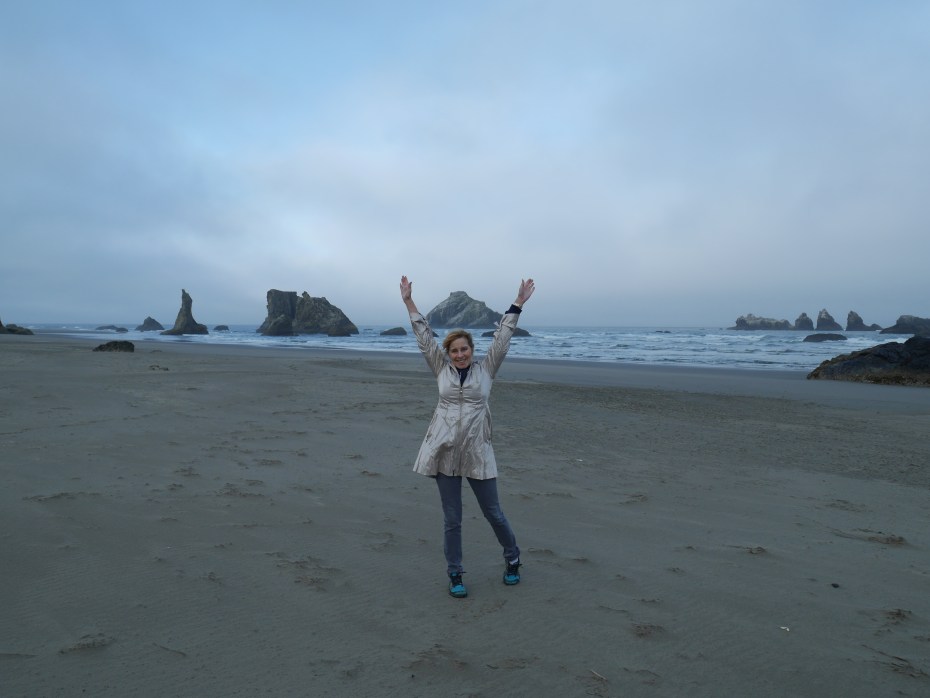 Claire went out and did a power walk, while I cleaned up some eMail and did a blog post. Then we strolled on the magnificent beach. The Oregon coast looks like something from a sci-fi movie or a video game. The giant rocks that jut from the sand and the water provide unique views from every angle.